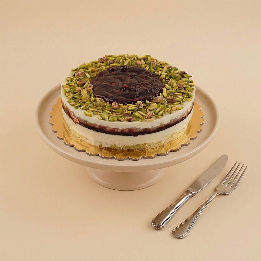 يتكوّن الكيك من طبقة إسفنجية بنكهة الفستق، تعلوها طبقة موس الفستق الكريمي الغني، مع حشوة الرمان التي تضيف نكهة حامضية خفيفة، ويُزين الوجه بالفستق المجروش مع طبقة لامعة من صوص الرمان.