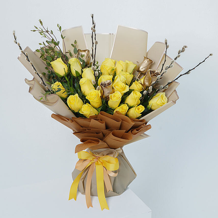 بوكيه ورد أصفر وذهبي مغلف بورق بيج