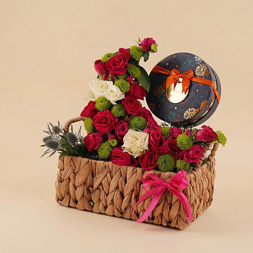 هدية فاخرة تنبض بالأناقة وتجمع بين جمال الورود الحمراء والبيضاء مع لمسة شوكولاتة فينشي الإيطالية الراقية. تنسيق غني بالألوان والتفاصيل داخل سلة طبيعية أنيقة، يجعلها خياراً مثالياً للهدايا المميزة في المناسبات أو كلفتة تعبّر عن الذوق الرفيع والمشاعر الصادقة بطريقة لا تُنسى.