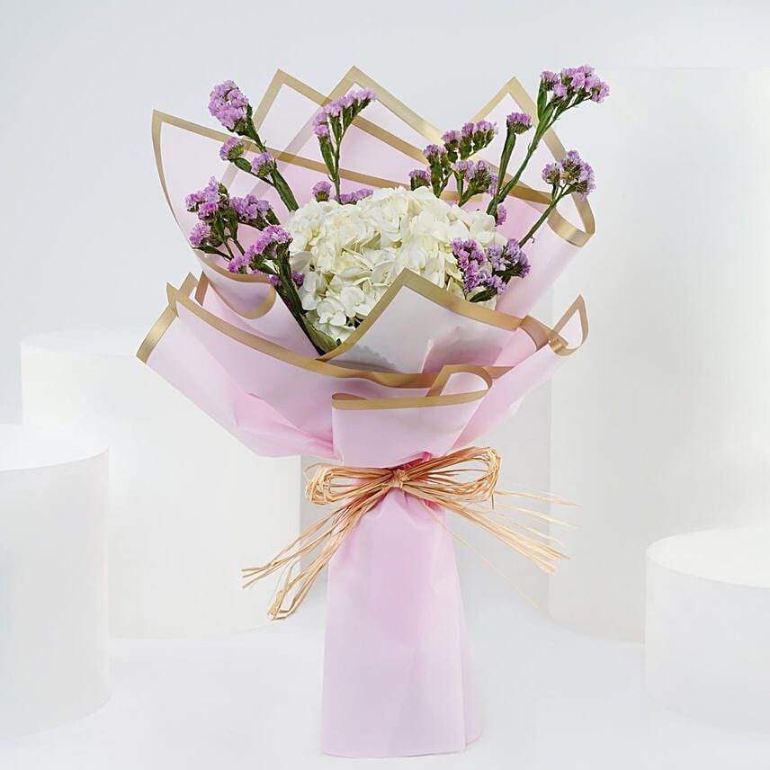 Grace any occasion with our elegant White Hydrangea Bouquet. This stunning arrangement features pristine white hydrangeas, beautifully wrapped in soft pink paper and accented with purple statice and raffia. It's the perfect gesture to express your heartfelt sentiments.