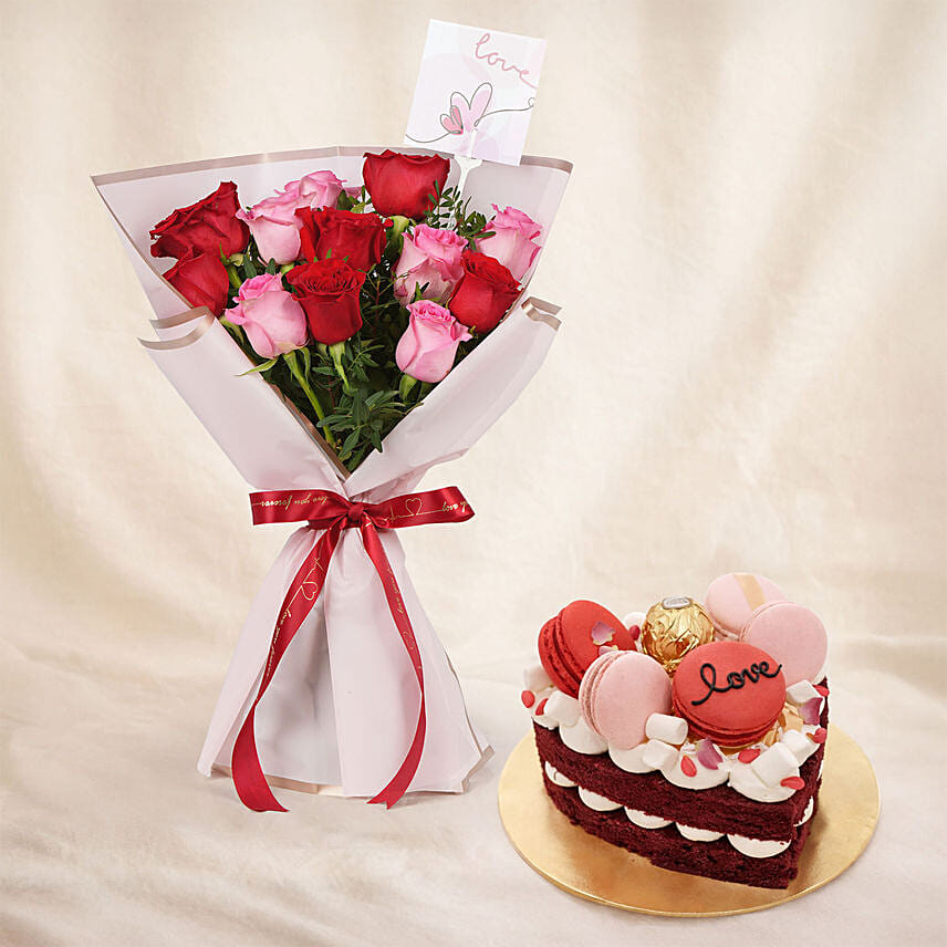 A graceful expression of love, this elegant bouquet blends classic red roses with soft pink blooms, finished with lush greenery and a heartfelt love card-perfect for romantic moments that speak straight from the heart.