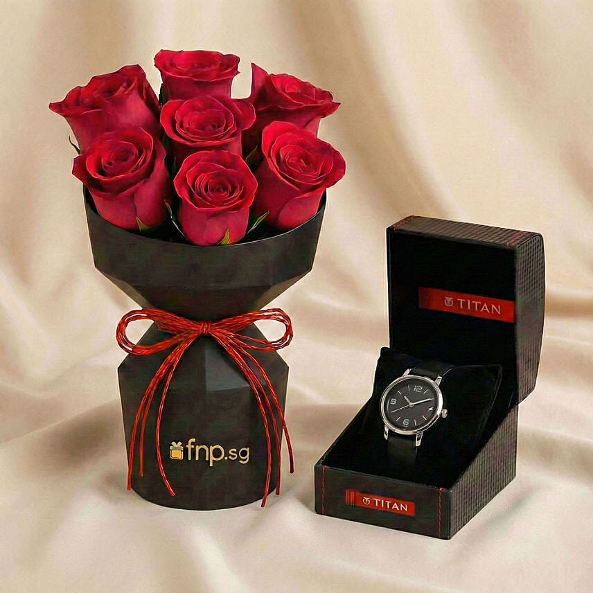 An elegant expression of love and luxury, this Valentine’s gift set beautifully combines the romance of red roses with the timeless charm of a premium Titan Raga watch-crafted to leave a lasting impression.