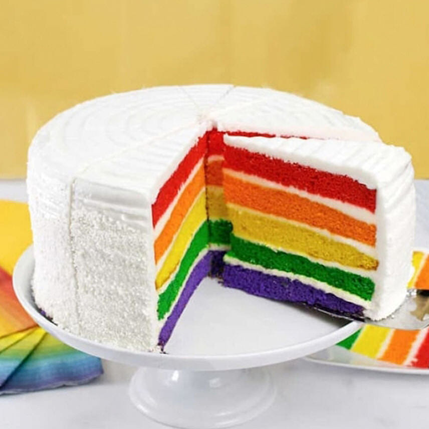 • خمس طبقات زاهية وملونة من هذا الكيك اللذيذ مثالية للاحتفال بأي مناسبة سعيدة أو مهرجان! لقد قمنا بتزيين هذه الحلوى برذاذ الفانيليا بنكهة خفيفة لإبقاء هذه المفاجأة الملونة سرًا حتى تقطع الشريحة الأولى. مثالي للاحتفال بأي مناسبة سعيدة أو مهرجان- للأطفال والكبار على حد سواء