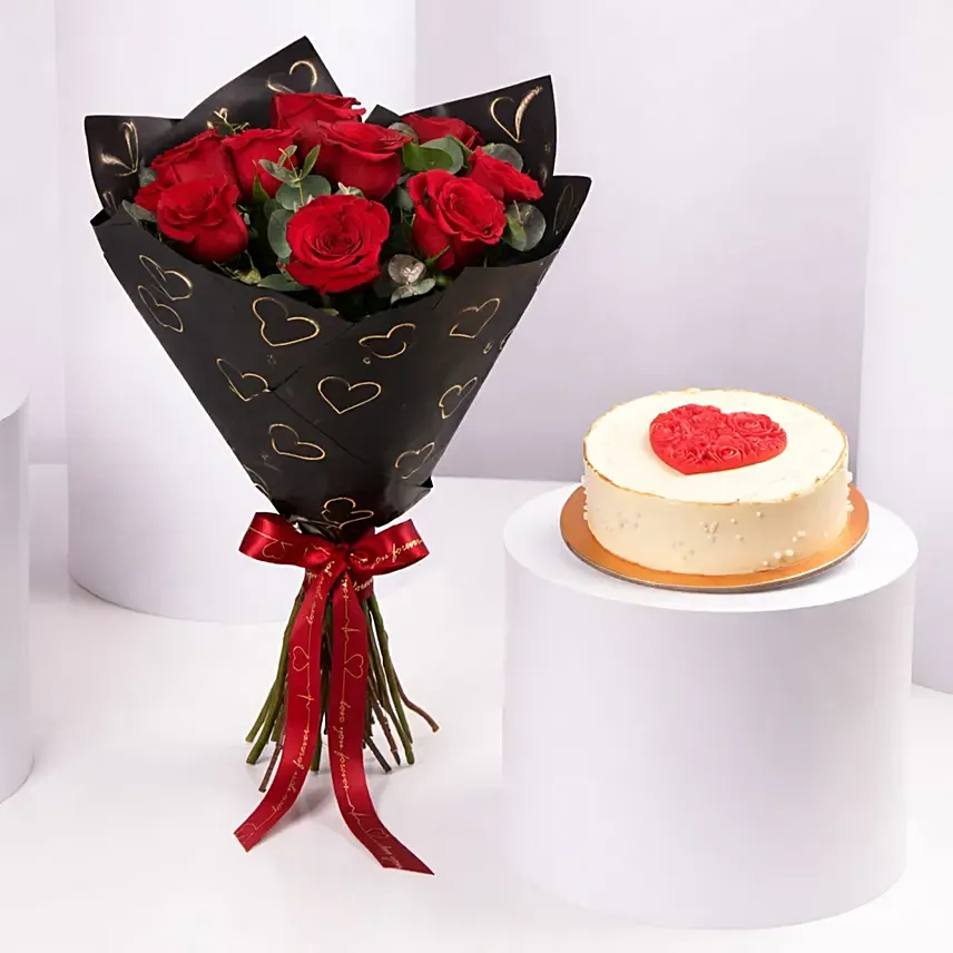 Show your love with this beautiful gift set, featuring 10 fresh red roses wrapped in elegant black paper adorned with golden hearts. The bouquet is paired with a 500g cake, decorated with a heart-shaped design made of red roses, making it the perfect gift for Valentine's Day, anniversaries, birthdays, or any romantic occasion.