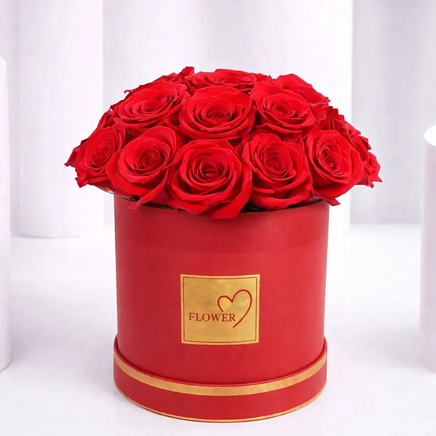Radiate love and affection with this exquisite arrangement of 15 fresh red roses, carefully arranged in a high-quality round box with a gold accent. The luxurious presentation adds a touch of elegance, making it the perfect gift for anniversaries, Valentine's Day, birthdays, or any romantic occasion. This classic yet sophisticated design conveys your deepest emotions in the most stunning way.