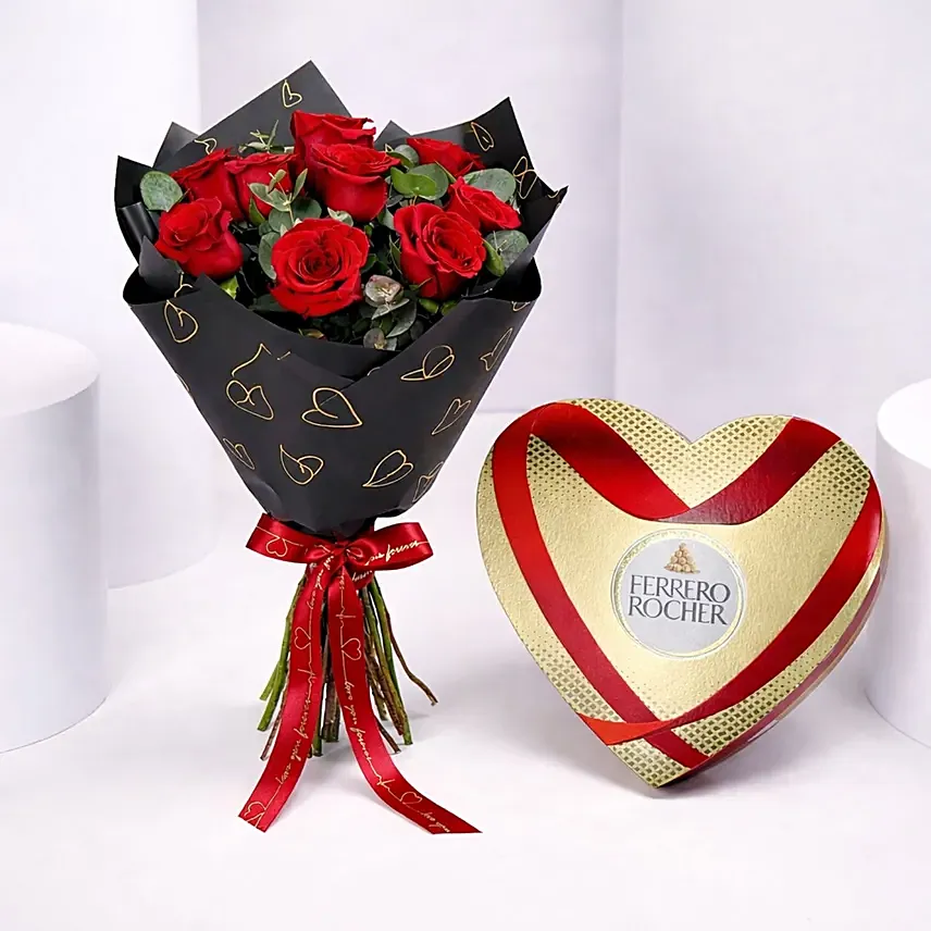 Celebrate your love with this sweet and romantic gift set, featuring 9 fresh red roses, carefully arranged and wrapped in black paper adorned with golden hearts. The bouquet is paired with a heart-shaped box of 125g Ferrero Rocher chocolates, making it the perfect gift for Valentine's Day, anniversaries, birthdays, or any occasion to show your affection and appreciation.