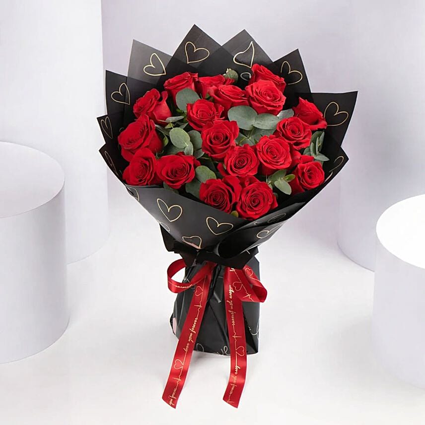 Make a bold romantic statement with this stunning 18 red roses bouquet, elegantly wrapped in black paper adorned with golden hearts and finished with a luxurious red ribbon. Perfect for anniversaries, Valentine's Day, birthdays, or “just because” surprises, this exquisite arrangement conveys love, admiration, and passion in a beautifully designed gift.