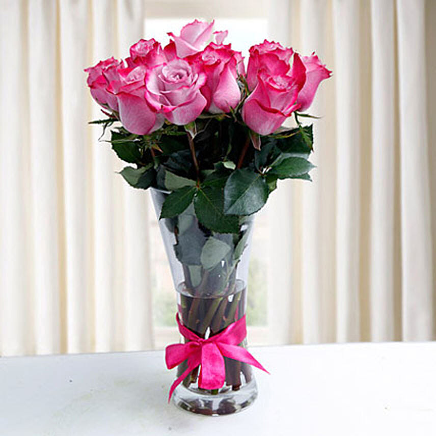 Exclusively designed to capture your beloved's heart, this bouquet comprising of the bunch of dual colour Purple Roses arranged in a glass vase and embellished with Pink ribbon is sure to create a space where modern style and love unites. It has all the beauty and grace that can effortlessly make your lady love fall for you again and again.