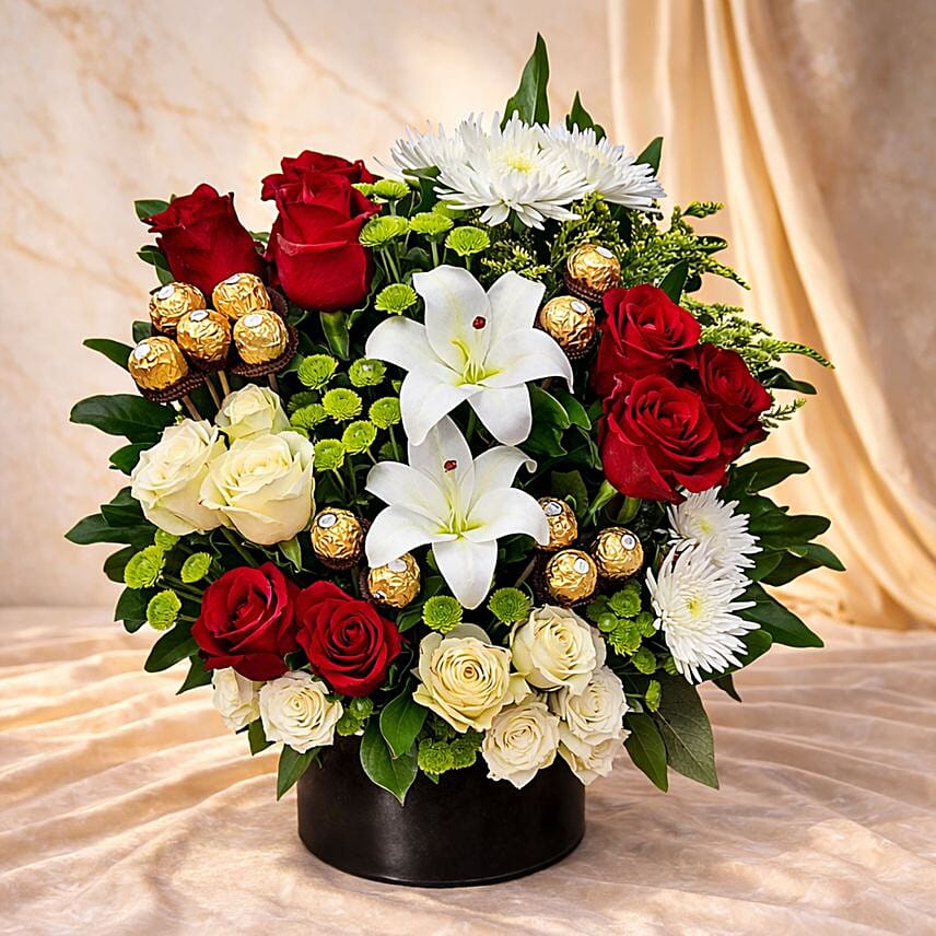 Red and White Roses Lily and Ferrero Rocher Luxury Arrangement