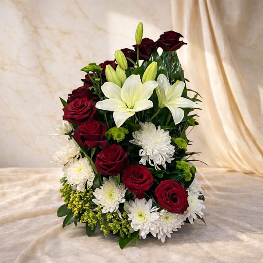 Red Roses White Lily and Chrysanthemum Elegant Floral Arrangement