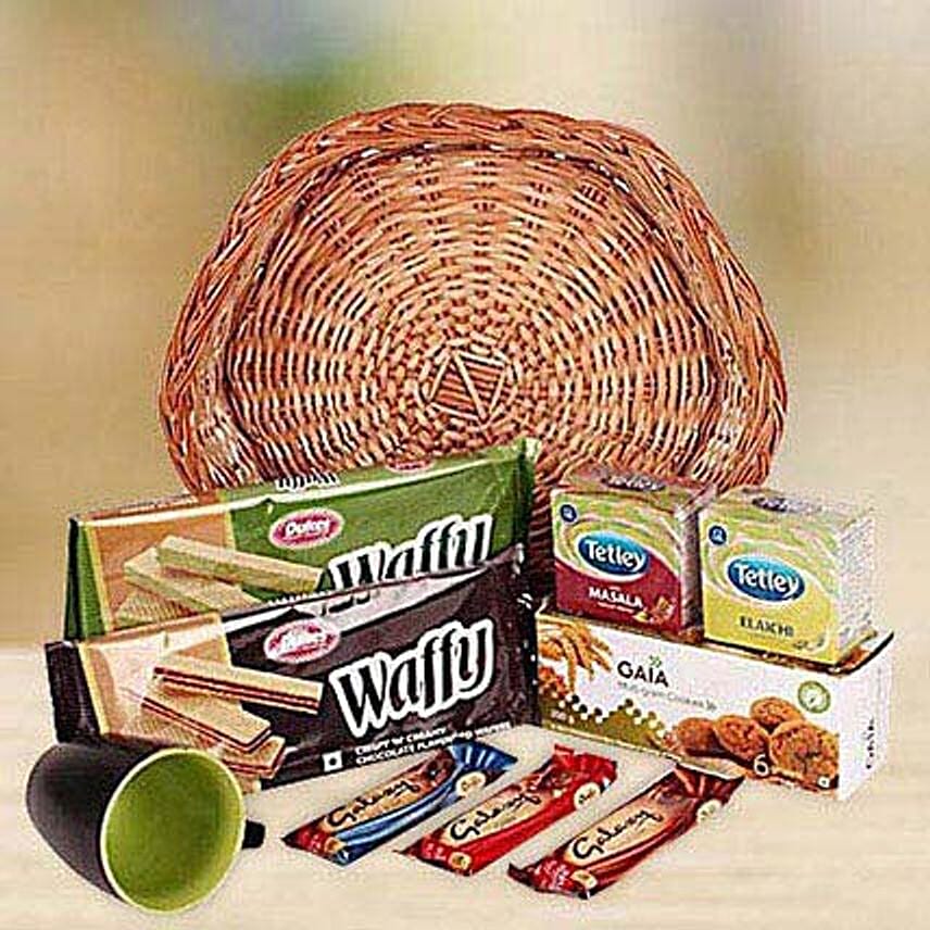 A treat that is guaranteed to give you lots of praises. Delight your loved ones with this basket brimming with waffers in chocolate and pineapple flavour of 75 grams each, two packs of tetley tea with 12 tea bags each, 200 grams of cookies, 36 grams each of three galaxy chocolates and a coffee mug.