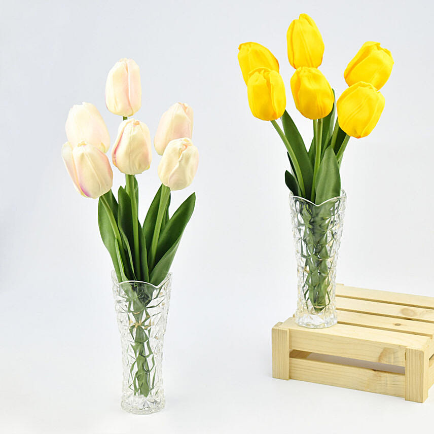 One of our most loved arrangements is the optimistic yellow & light pink artificial tulips vases and there is enough reason for it to be so widely adored. This lovely arrangement set features long stems and gorgeous green leaves in tow. These flowers come in a glass vase, made to match and enhance their beauty. With its bright and happy colour, this is an arrangement of flowers that signifies happiness and endless hope.