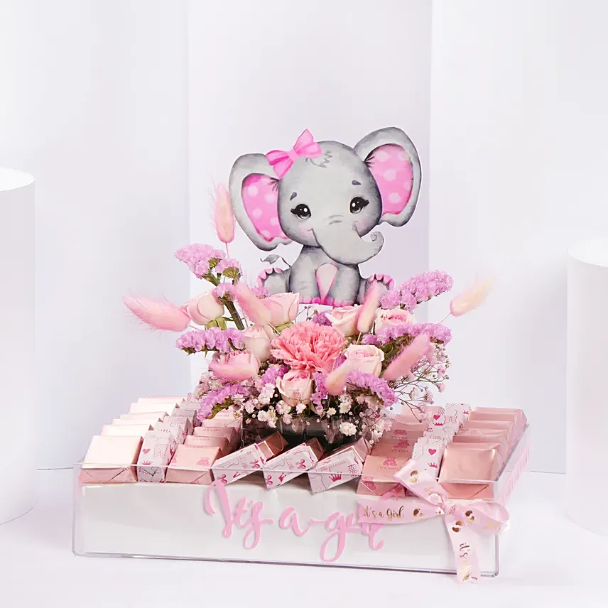 A delightful gift arrangement celebrating the arrival of the bundle of joy. Gift this cute tray full of chocolates and flowers to the budding parents of a newborn girl. Send happy vibes with beautiful flowers, and the added chocolates are a treat for the parents.