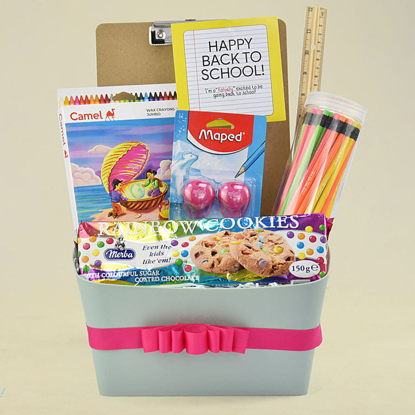 Featuring stationary essentials & cookies, our back to school hamper will keep the kids busy and happy. An ideal gift for the kids going back to school.