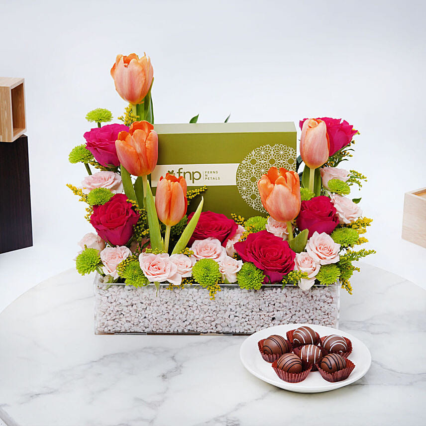 This is what your loved one would feel when they receive this beautiful combo. Where on one had a gorgeous bunch of mixed flowers would be easy on the eyes, the chocolates would tantalise their taste buds.