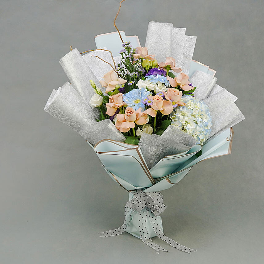 The neutral tone of cappuccino roses and lisianthus with the striking contrast of gerberas, hydrangea, and aster creates this truly sensational bouquet. The salix sticks add the pop of green and bring the entire look together. The luxurious bouquet is expertly wrapped and tied with a ribbon to deliver happiness in a bunch.