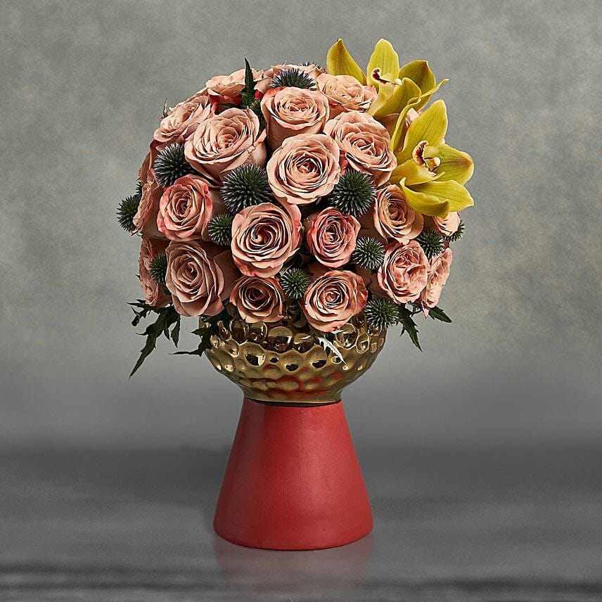 When you gift an arrangement of cappuccino roses to your near and dear ones, you gift love, gratitude and affection to them. Gift your near and dear ones this floral golden vase on any special occasion.