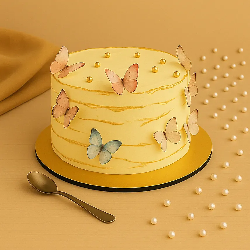 • Beautifully Decorated with buttercream and adorned with butterflies all over the cake