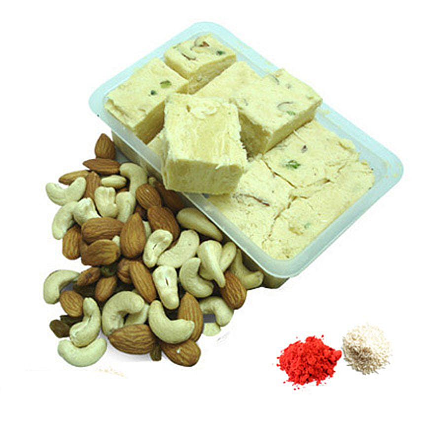 Follow the tradition and send lots of sweets to your brother on the occasion of Bhai Dooj. This hamper is a selection of 250 grams of soan papdi, 500 grams of dry fruits mixture of almonds and cashews and packs of roli-chawal.