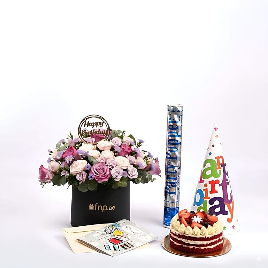 delightful birthday combo featuring a beautiful flower box paired with a rich and indulgent red velvet cake - the perfect way to celebrate with elegance and sweetness.