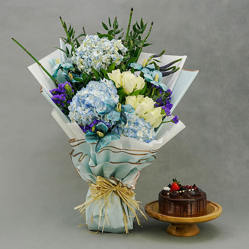 Overflowing at the seams with beauty and charm, the bouquet of exquisite flowers will deliver peace and joy at your loved one’s door. The combination of blue and white blooms with a touch of green snake grass is the ultimate wow gift beautifully wrapped and tied. The heavenly sweetness of chocolate fudge cake is the cherry on top, literally!!