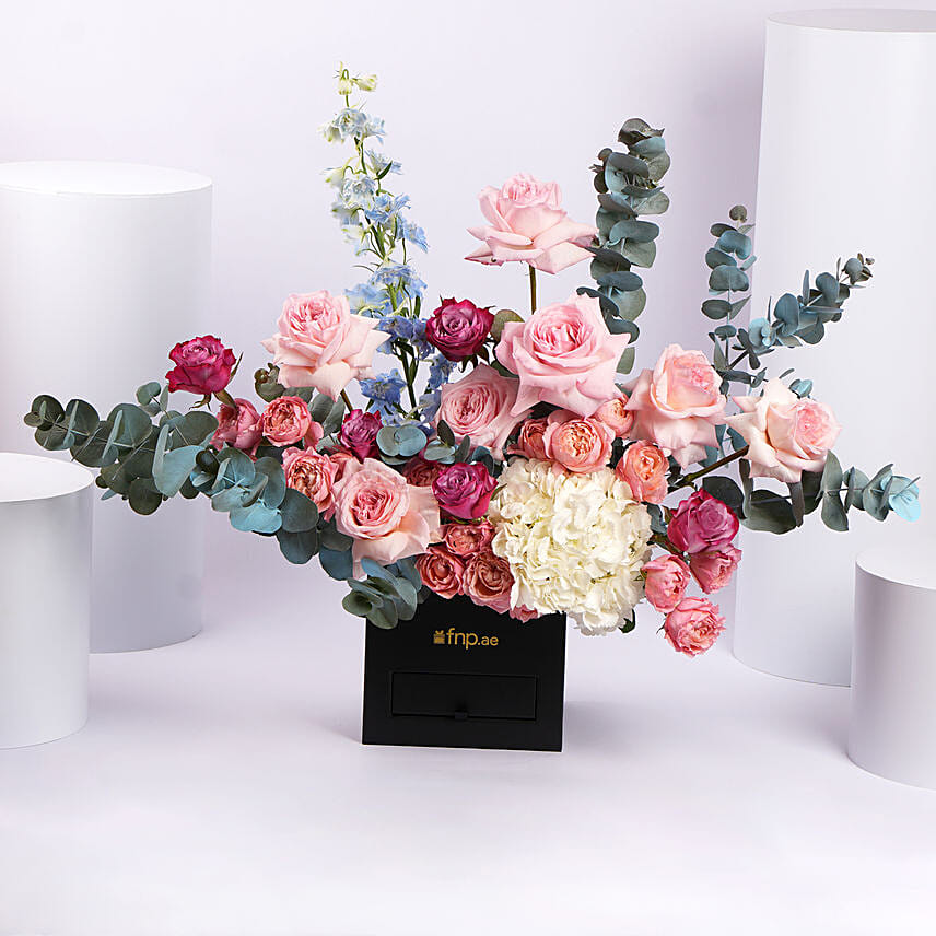 Soft, romantic, and artistically arranged, this floral creation is a celebration of gentle colors and graceful textures. Blending pastel pinks, peaches, and purples with calming whites and hints of blue, it creates a dreamy visual harmony. Styled in a sleek black square box, this arrangement adds elegance and warmth to any special moment or refined space.