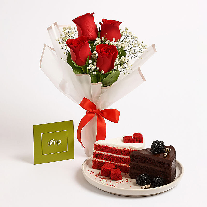 Bunch of 5 Red Roses with Red Velvet And Truffle Slice Combo