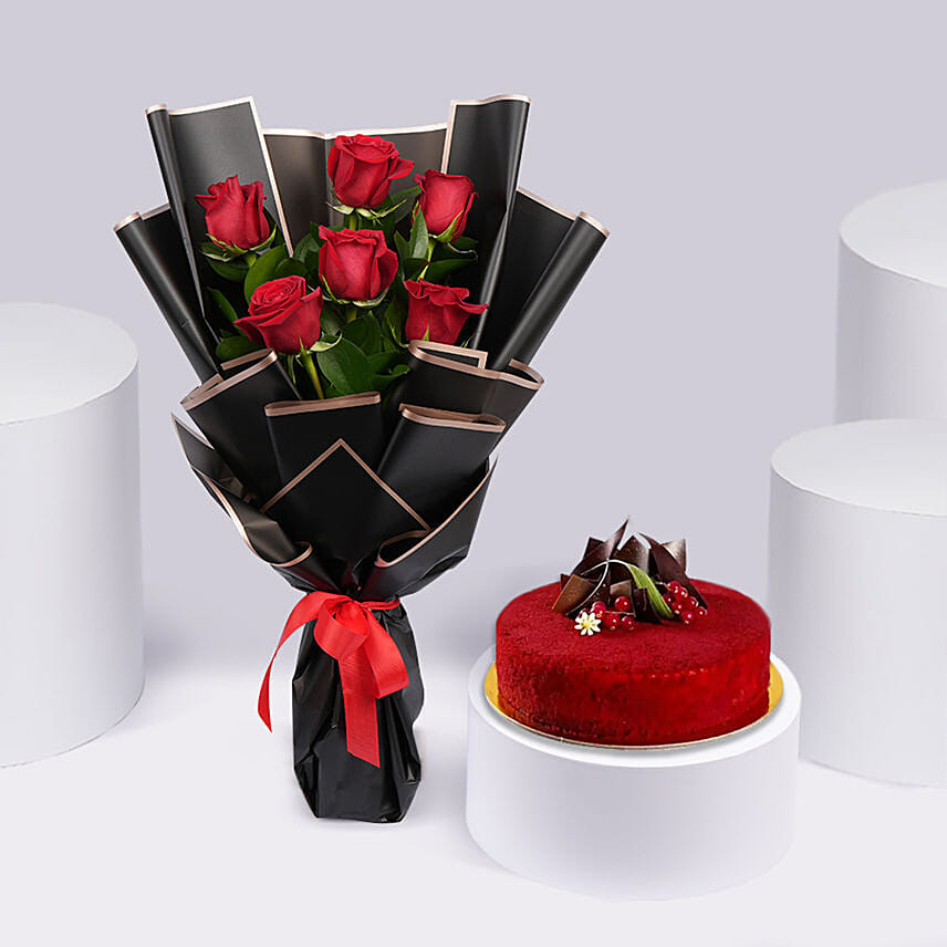 Bunch of Beautiful 6 Red Rose with Cake