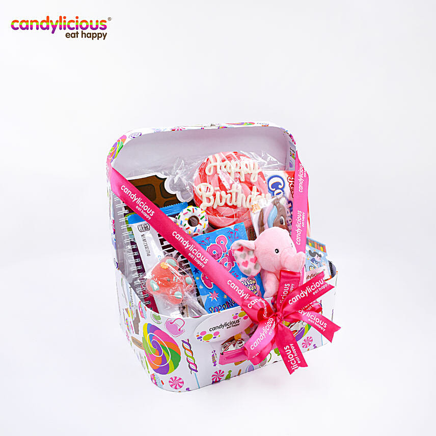 • Candylicious Candy Mix Happy Birthday suitcase hamper includes Happy Birthday Round Lollipop,Small Elephant Toy, Candy Theatre Box, Cupcake shape A5 Notebook, Donut Pen, Chocolate Lollipop, Jelly Lollipop,Hershey's Cookie and Creme Chocolate King Size, Chocolate Stick, Kufa Lollipop.