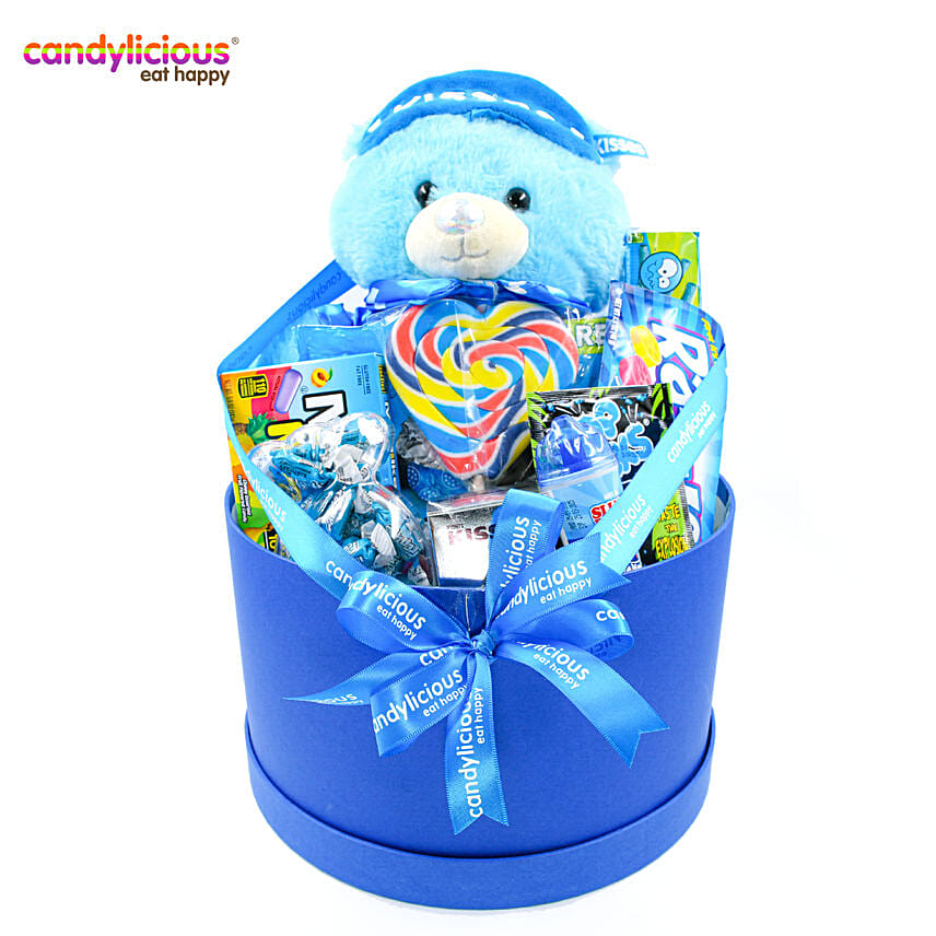 • Candylicious Gift Box Regular Hamper with Kisses Bear includes 14" Kisses Bear with Night Shirt, Slush Puppy Spray Candy, Kisses Cookies N Crème, Kisses Milk Chocolate, Sour Patch Blue Raspberry, Assorted Candy in Candy Shape Container, Poprock Candy, Candy Theatre Box, Round Lollipop 95g
