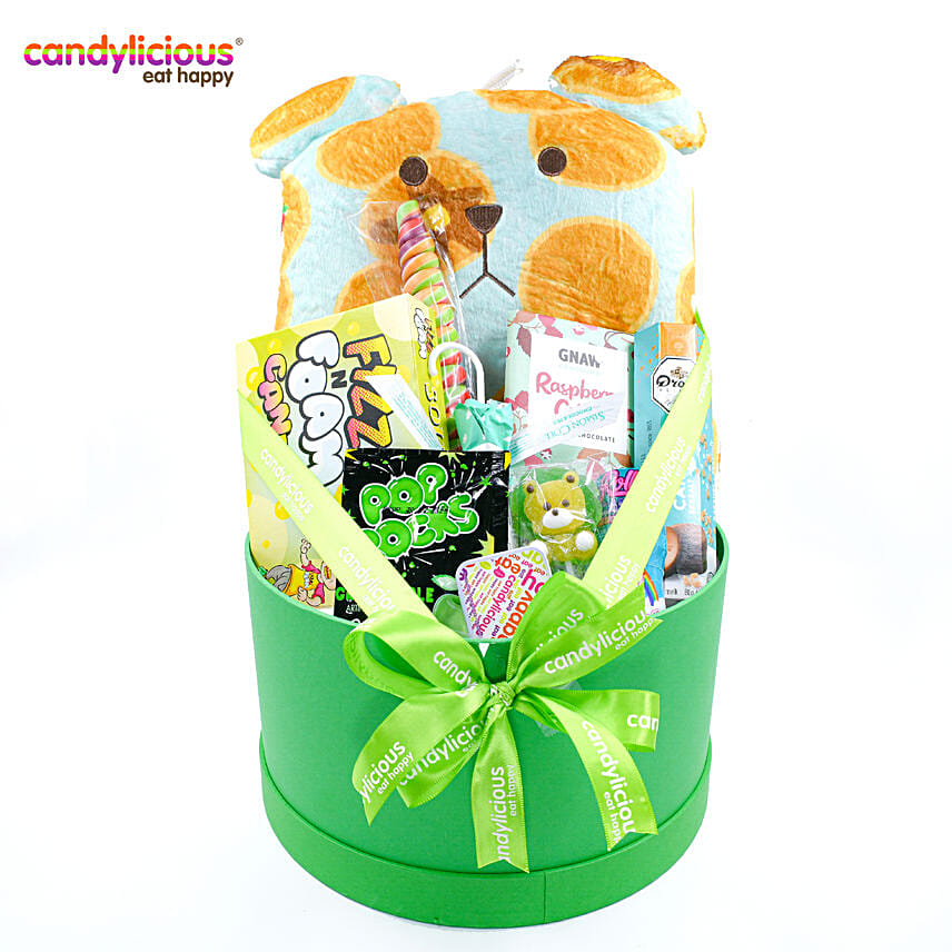 • Candylicious Gift Box Regular with Sloth includes Sloth Pillow Cushion 31x44cm, F&F Sour Lemon Candy, Drostles Pastilles Milk Choc, Poprock Candy, Candylcious Candy Tin 16g, Gnaw Chocolate Bar, Jelly Lollipop, Dr.Sweet Roller Candy, Sprial Lollipop 95g