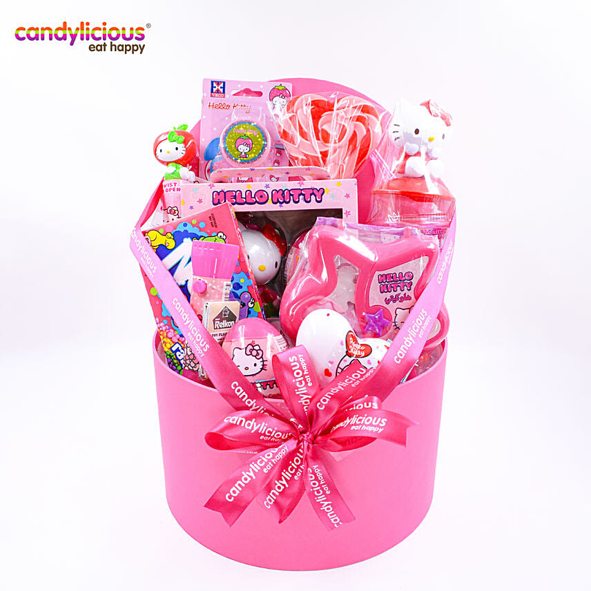 • Candylicious Hello Kitty Character Gift box Hamper includes Hello Kitty Candy Tube 20g, Hello Kitty Gift Set w/candy 10g, Hello Kitty Candy Cup Container w/candy 18g, Hello Kitty Star Bag w/candy 40g,Hello Kitty Surprise Heart W/Candy, Hello Kitty Toy Flashlight 8g,Hello Kitty Super Surprise Egg w/candy 10g,Hello Kitty Wrist Band w Candy 8g, Candy Theatre Box.