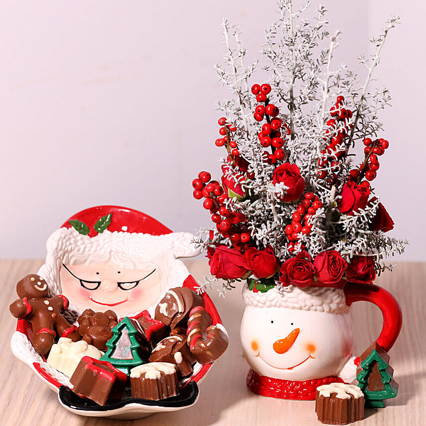 • 1 Stem Ilex Berry and White Cochia fern with 12 Pieces asssorted Chocolates in a Ceramic Plate