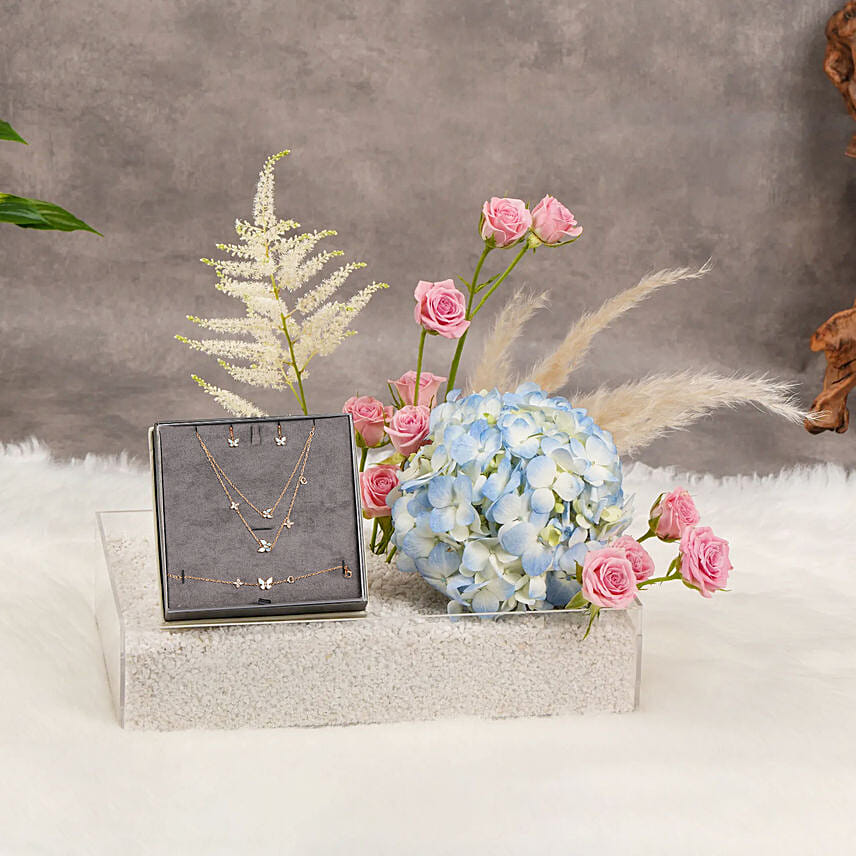 "Featuring a complete jewelry collection adorned with dainty butterfly motifs, this set includes coordinated necklaces, a bracelet, earrings. The butterflies symbolize transformation and freedom, making this an ideal gift for celebrating new beginnings or milestones. Perfect for birthdays, anniversaries, or any heartfelt gesture"