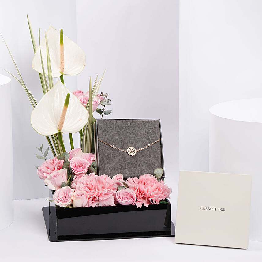 This exquisite gift set features a necklace, a delicate bracelet, and matching earrings, all adorned with the signature Cerruti "C" logo encased in a radiant circular motif, Presented in a luxurious floral arrangement, this set is the perfect gift for special occasions.