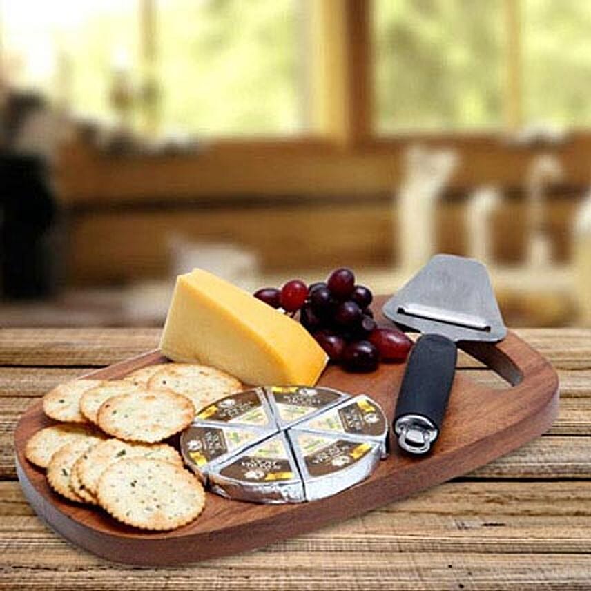 Cheese lovers will surely rejoice this exclusive gift hamper that includes wooden Cheese platter with Gouda cheese cube, Savoury crackers, stainless steel Cheese cutter and a bunch of Red grapes. This irresistible combo is sure to thrill your loved ones. Warm up any time of your beloved and brighten up her day with this exquisite gift collection.