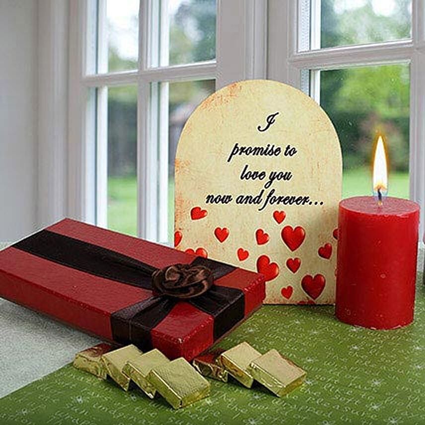 • 1 Assorted Square Shape Chocolate 250gms, 1 Chocolate Box 9X4.5 Inches Approx., 1 Table Top 6x8 Inches Approx., 1 Red Candle 4x2.5 Inches Approx.