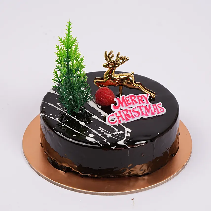 Make your festive celebrations sweeter with this indulgent Christmas Chocolate Cake. Covered in a glossy chocolate glaze and decorated with a mini Christmas tree, reindeer, and a Merry Christmas tag, this cake brings festive joy to every occasion.