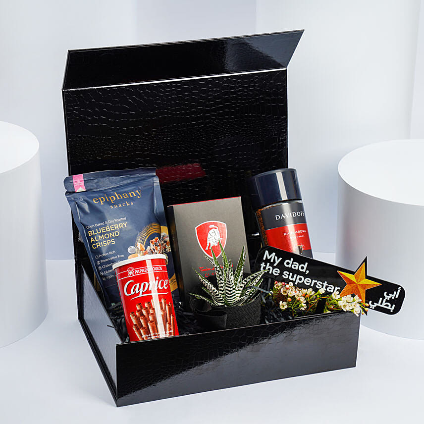 Spoil Dad with the My Dad The Super Star hamper, thoughtfully curated to include an assortment of his favorite treats and essentials.Beautifully packaged in a wooden box, this hamper is a perfect way to show your appreciation and make Dad's day unforgettable.