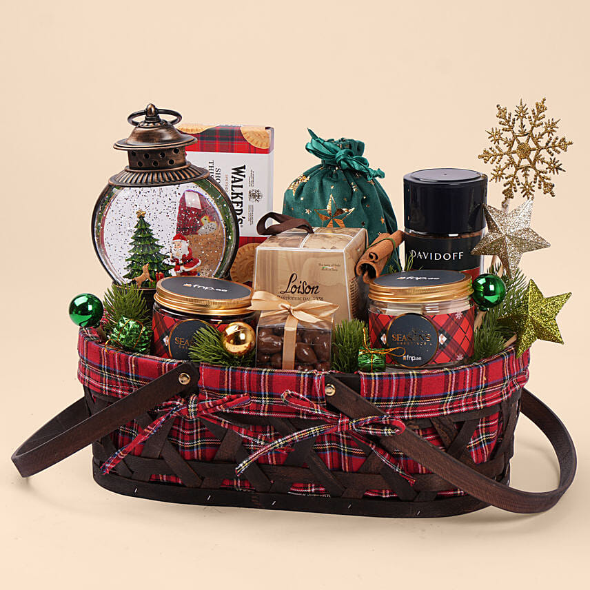 Make the festive season truly enchanting with this Premium Christmas Tartan Gift Basket — a beautifully curated blend of gourmet delights, cozy winter treats, and charming holiday décor. Presented in a classic Christmas check basket with deep brown handles and festive tartan lining, this hamper features a magical Christmas snow globe lantern, rich Davidoff coffee, Casa Rinaldi mini panettone, Walkers butter shortbread, and an elegant Xmas velvet pouch filled with luxurious hot chocolate powder. Two festive jars filled with chocolate-coated nuts and marshmallows add a delightful indulgence, while sparkling stars, colorful ornaments, cinnamon sticks, and seasonal greenery elevate the entire presentation. A perfect choice for family, friends, colleagues, or corporate gifting.