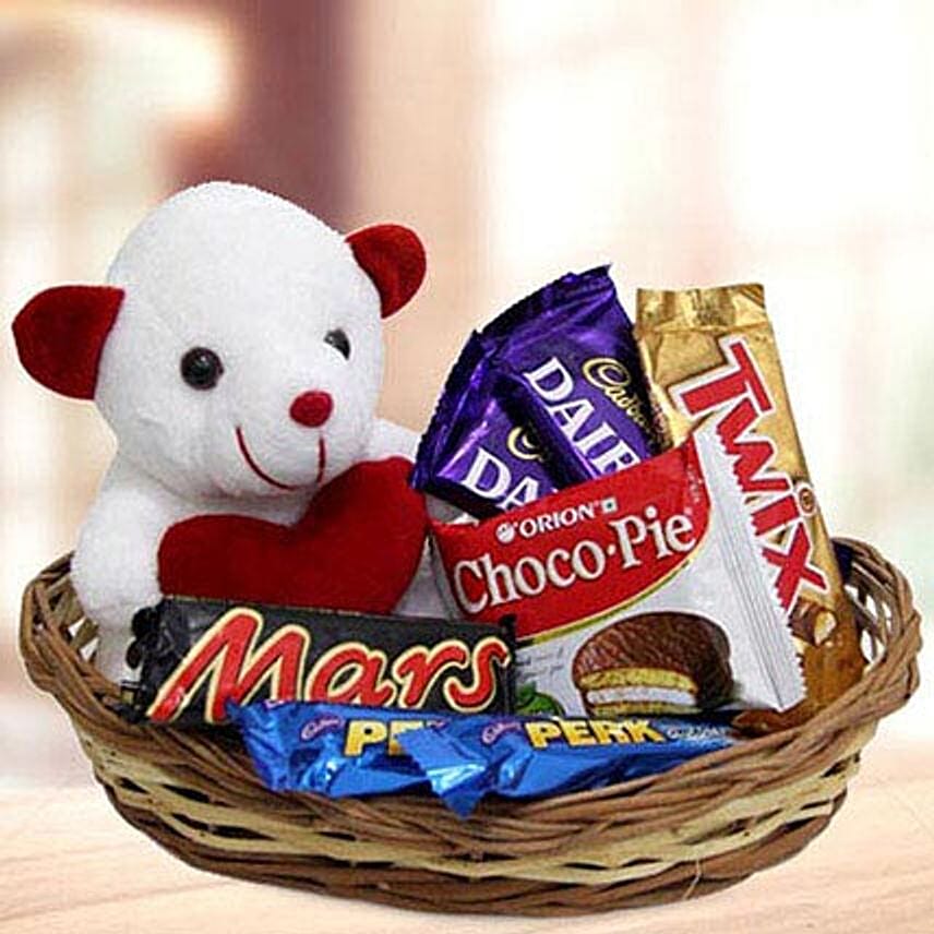 A perfect gift for your lady love to elevate her mood and make her believe that she is the one whom you have so dearly loved. Send her this basket full of a 6 inch soft and cuddly soft toy, a choco pie, 14 grams each of two dairy milk, 58 grams of twix, 51 grams of mars and two perk chocolates.
