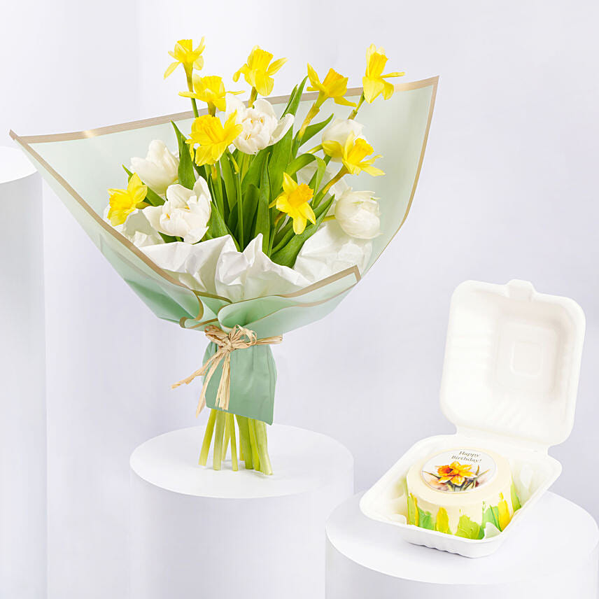 Daffodils and Tulips Birthday Flower Bouquet With Bento Cake