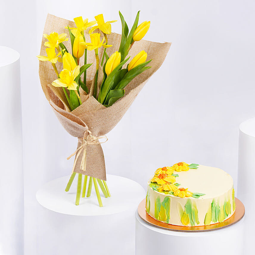 Daffodils withTulips Birthday Flower Bouquet With Cake