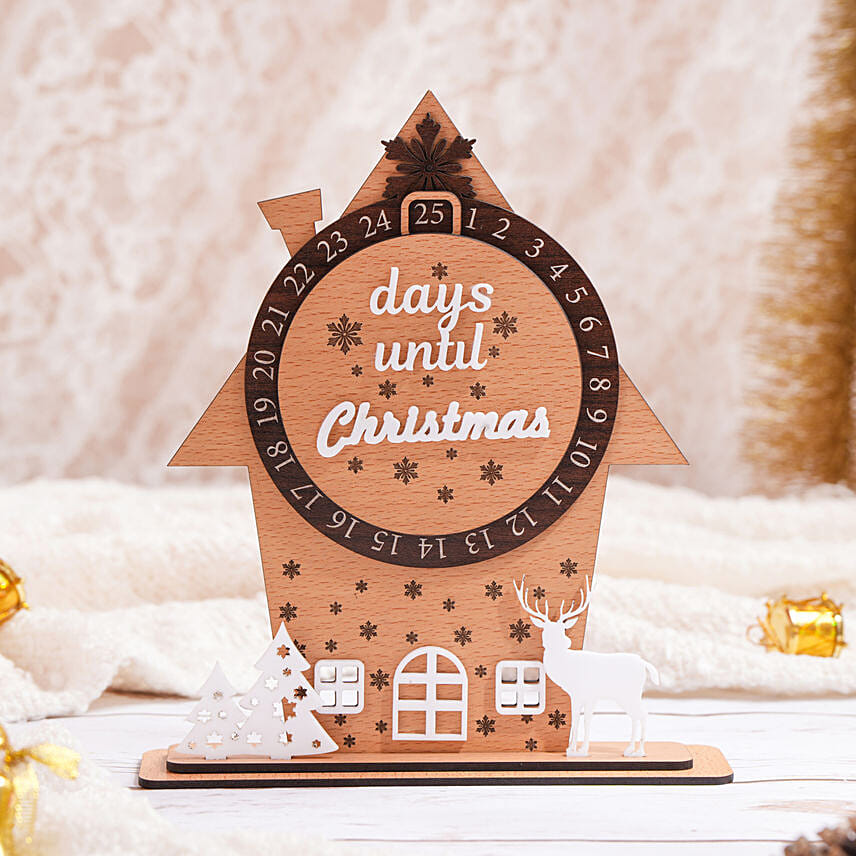 • A charming wooden house-shaped countdown calendar with intricate details, perfect for celebrating the holiday spirit.