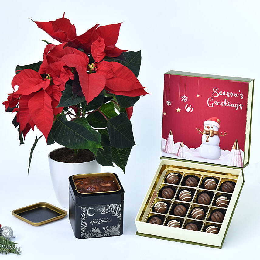 A magical Christmas cheer for your loved ones!! A traditional Poinsettia, plum cake, and chocolates are the perfect holiday season greetings gift. A beautiful arrangement for your friends, family, colleagues, or special someone.