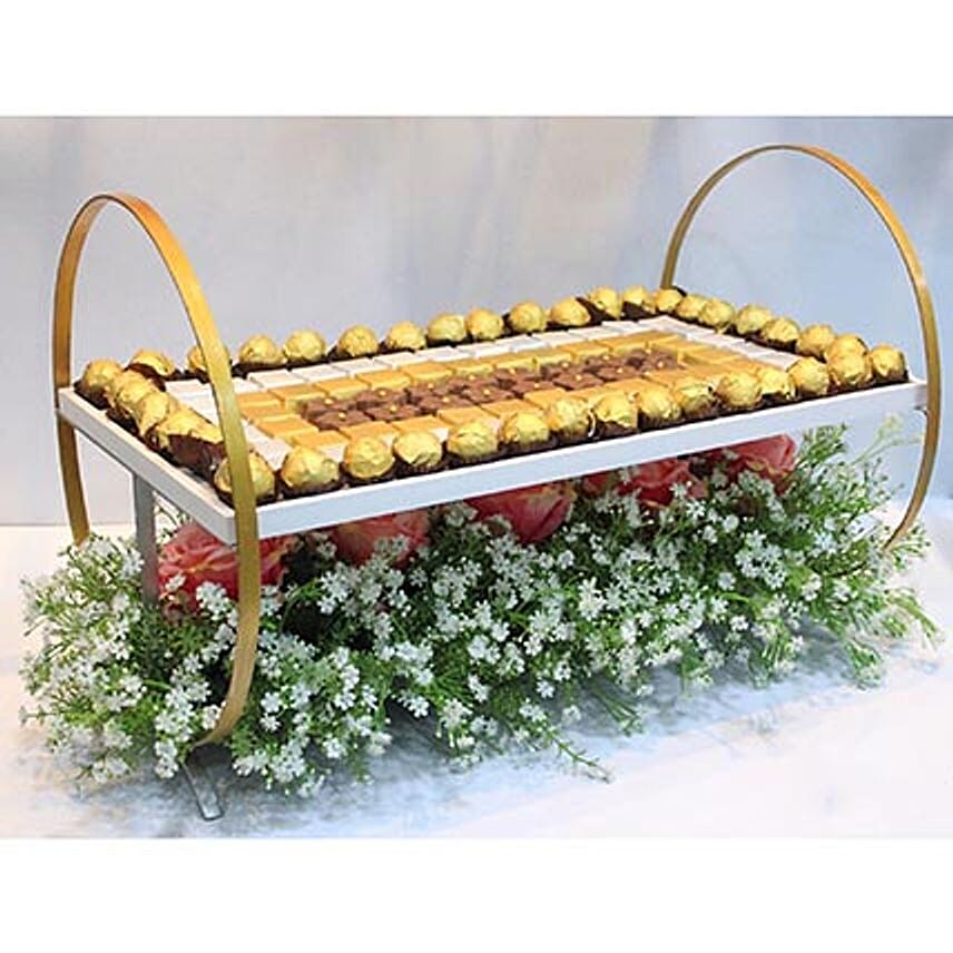 Designer tray with 3.5 Kg Belgium chocolate. The decoration will certainly leave a huge impression on your guests