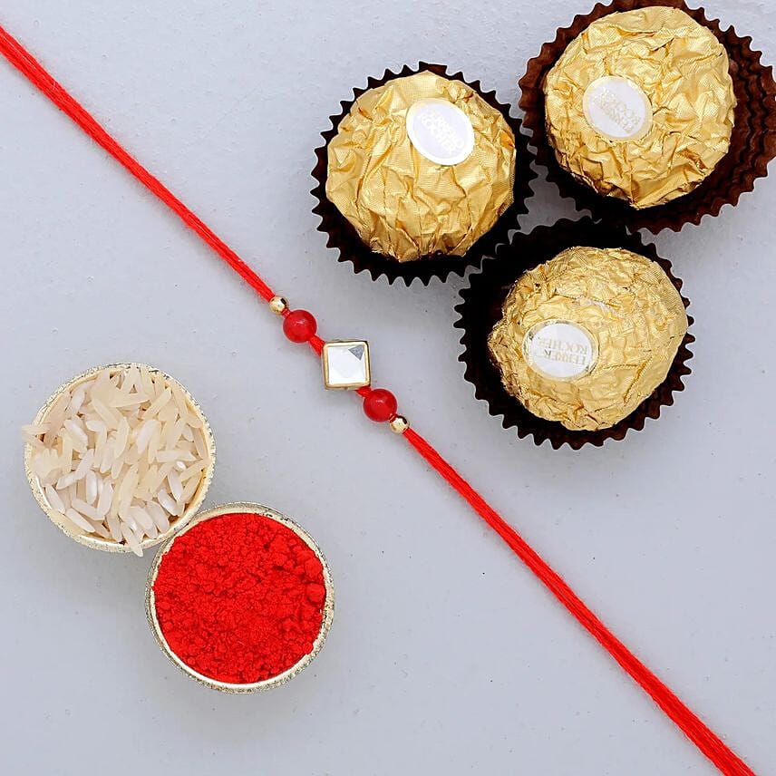 Designer Round Rakhi And 3 Pcs Ferrero Rocher