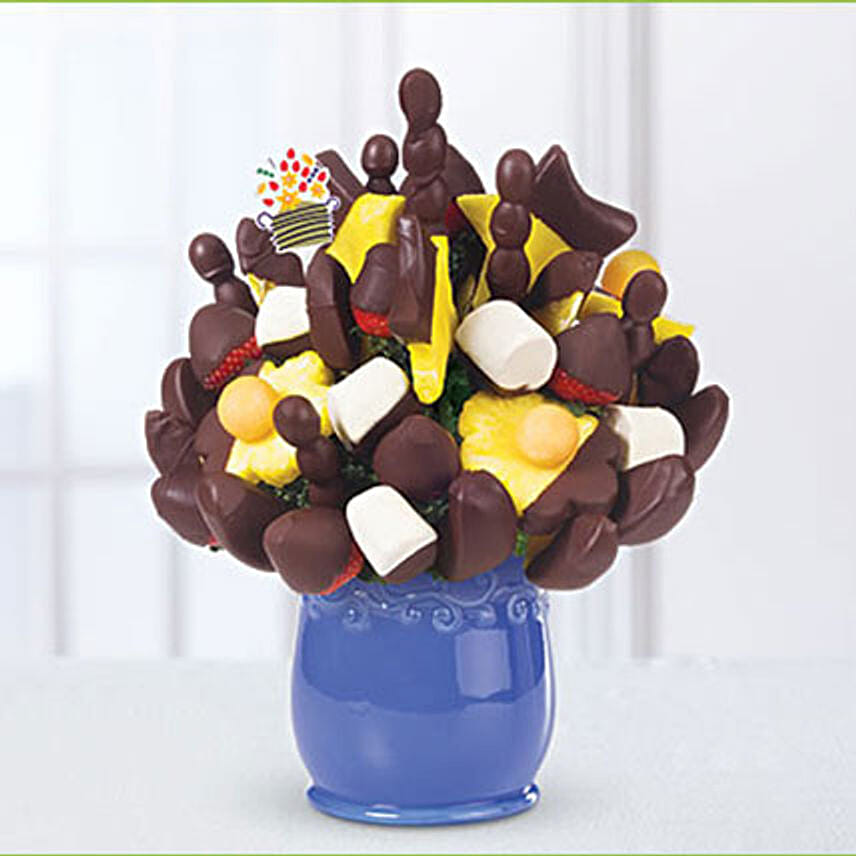 What excites the mind can easily satisfy the taste buds? Share this mouth-watering combination of strawberries, grapes, apples, bananas and pineapple drenched in gourmet chocolate with your loved ones. It is a perfect gift option for your special ones that can quickly grab their attention within no time. The container may vary.