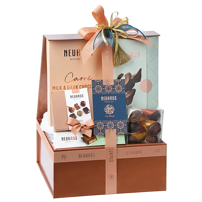 Immerse yourself in the joyous EID festivities with our beautifully curated hamper designed to be the ultimate gift for celebration. This elegant gift box is filled with: •Carré Classic-40 Wrapped Chocolates Milk & Dark •Cello Box- 6 pieces Cornets Gianduja •Ballotin Box- 8 Pralines •Plain Milk Chocolate Tablet •Milk Chocolate Bar- Almond Praliné Whether you are looking for a gift for your loved ones or a corporate gesture, our EID Hamper is the perfect choice. Share the joy of EID and make this occasion even more special with our thoughtfully designed hamper. We carefully select every ingredient, ensuring that each praline is of the highest quality and of 100% natural origin. All our products are made without GMOs and without palm oil.