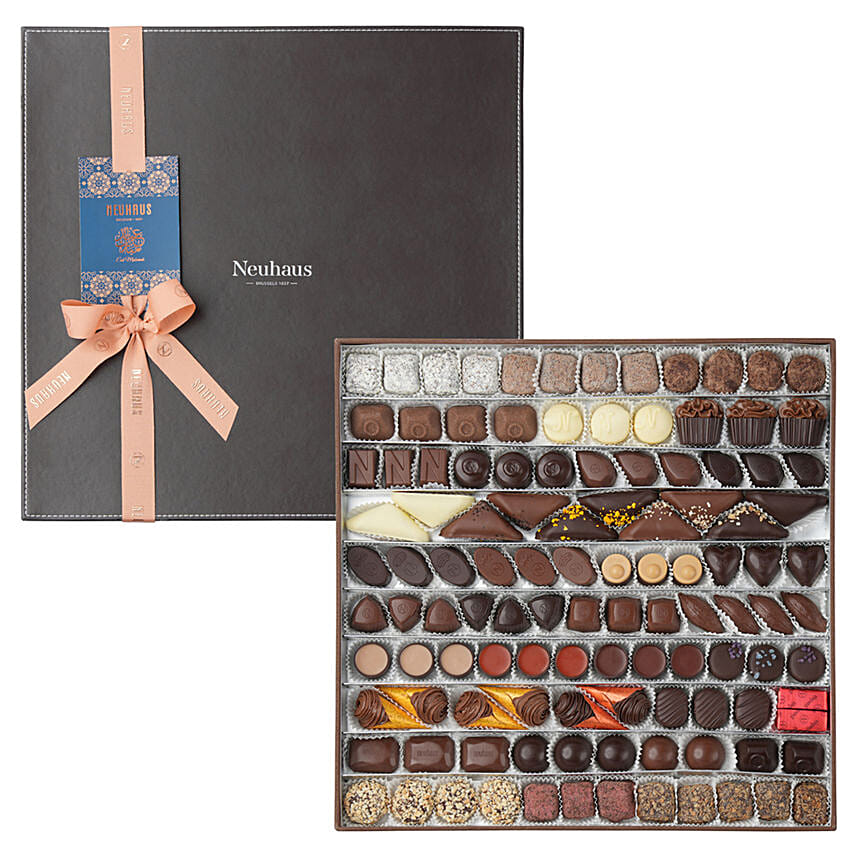 Celebrate the joyous occasion of EID with this delightful Neuhaus luxury box filled with your favourite iconic Belgian chocolates. The luxury Leather gift box contains -/+ 112 iconic Neuhaus chocolates: a selection of praliné, ganache, truffles and gianduja filled pralines. Elegantly displayed in a Luxury Leather gift box, this chocolate assortment is a wonderful VIP gift idea for loved ones, dear friends, and important business gifts. We carefully select every ingredient, ensuring that each Neuhaus praline is of the highest quality and of 100% natural origin. All our products are made without GMOs and without palm oil.